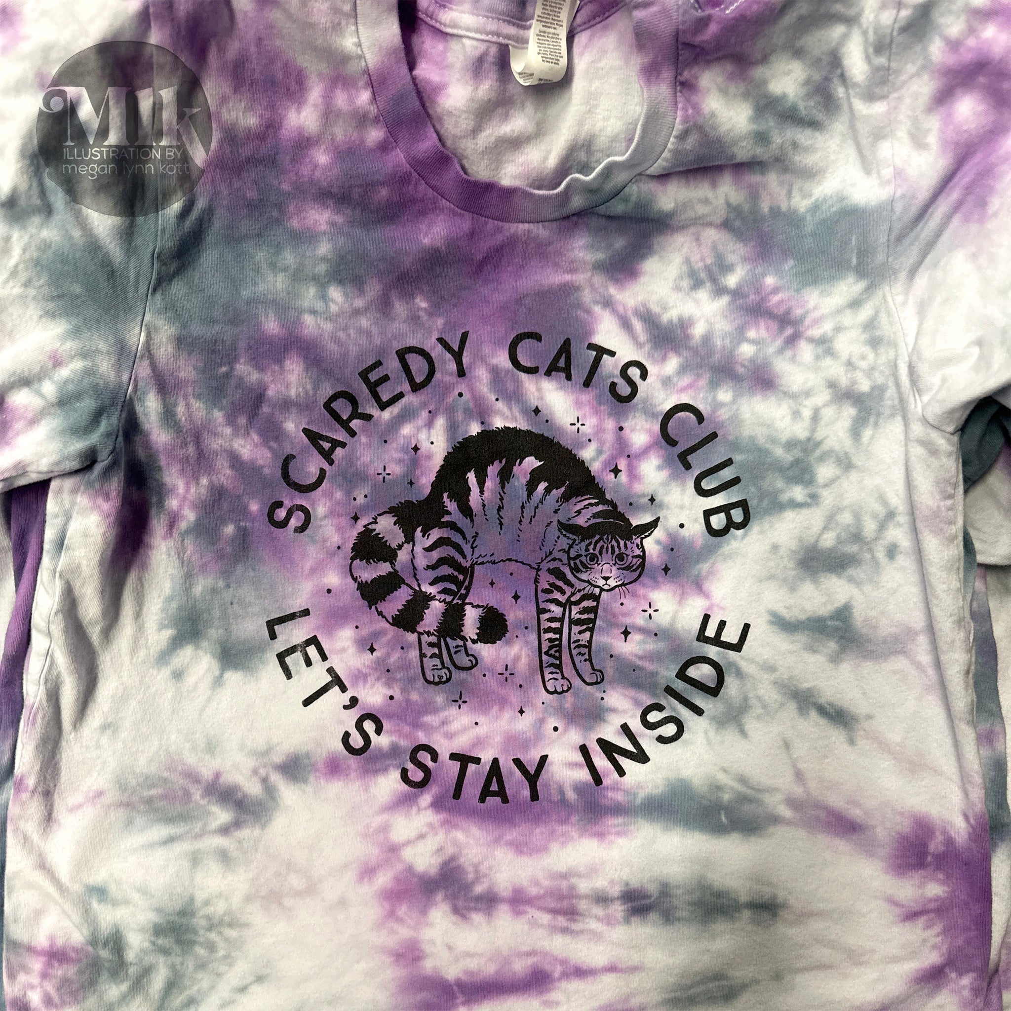 This tee was tie-dyed by hand using purple, blue/black, & lavender dye. Sizes go up to 2x. These tees are soft and lightweight, with the right amount of stretch (just what you've always wanted out of a cat). T-shirts are Bella & Canvas 3001 brand unisex fit. It's comfortable and flattering for all people regardless of gender. Screen-printed locally in Milwaukee by Red Wall Printing. All tees (and bandanas) come pre-shrunk.