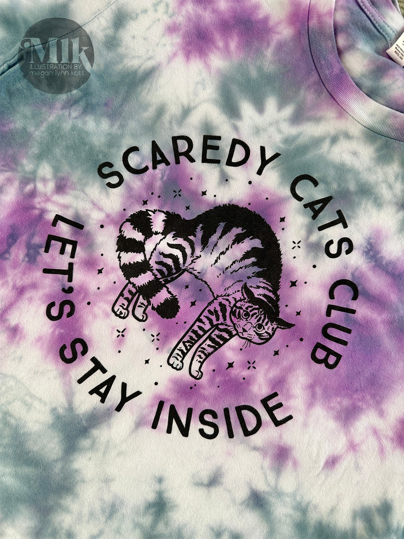 There are creeps out there! Let's stay inside! Join the Scaredy Cats Club with this cute kitty tee >^..^<